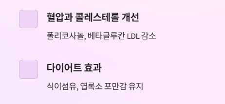 - 폴리코사놀과 베타글루칸이 LDL 콜레스테롤을 낮추고 혈관 건강을 개선합니다.